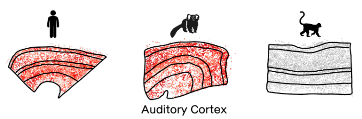 除了Pr-Al对立分子梯度轴,研究团队还获得了一项关于社交的意外发现:虽然猕猴在进化树上离人类更近,但在听觉皮层的分子特征上,狨猴反而与人类表现出更高的相似性。这主要是因为狨猴有着丰富的社会交流行为,会轮流应答、互相学习鸣叫。为了支撑这种高阶的沟通需求,狨猴大脑在演化中形成了与人类高度共享的神经分子机制,二者共享大量听觉‑发声调控相关基因与细胞类型排布模式。这使得狨猴成为研究人类语言起源、言语发育障碍、社交沟通相关疾病(如自闭症)的理想动物模型。